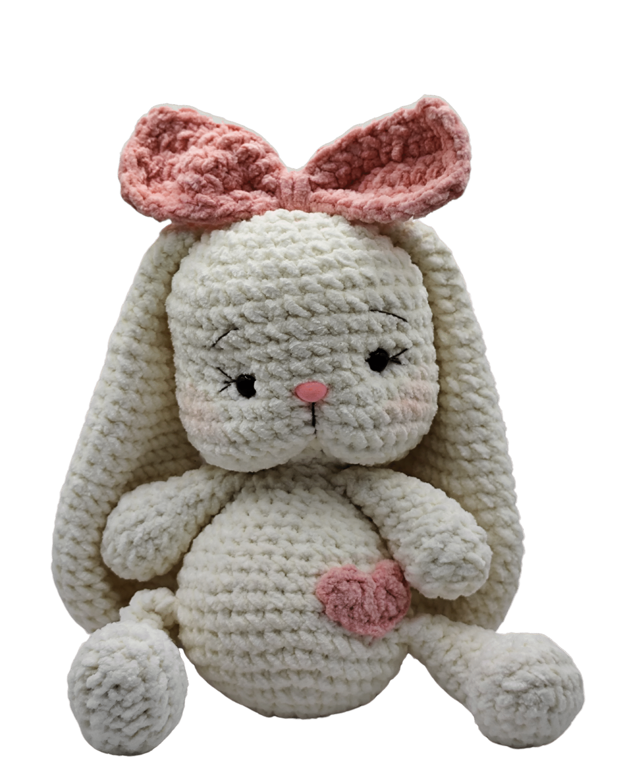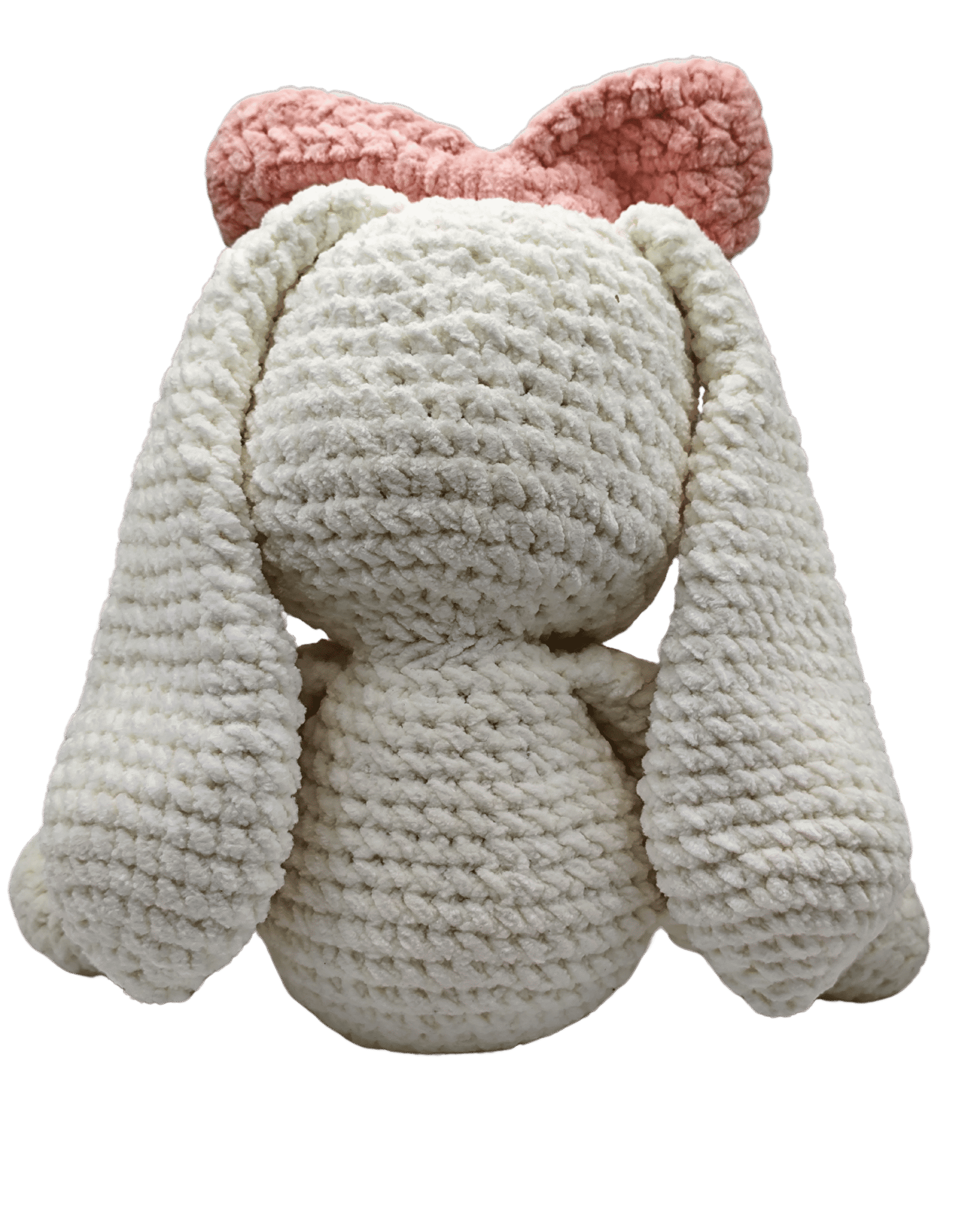 Figura tejida a mano con gancho, confeccionado con hilo de algodón suave color rosa y relleno esponjoso que le da forma y firmeza.