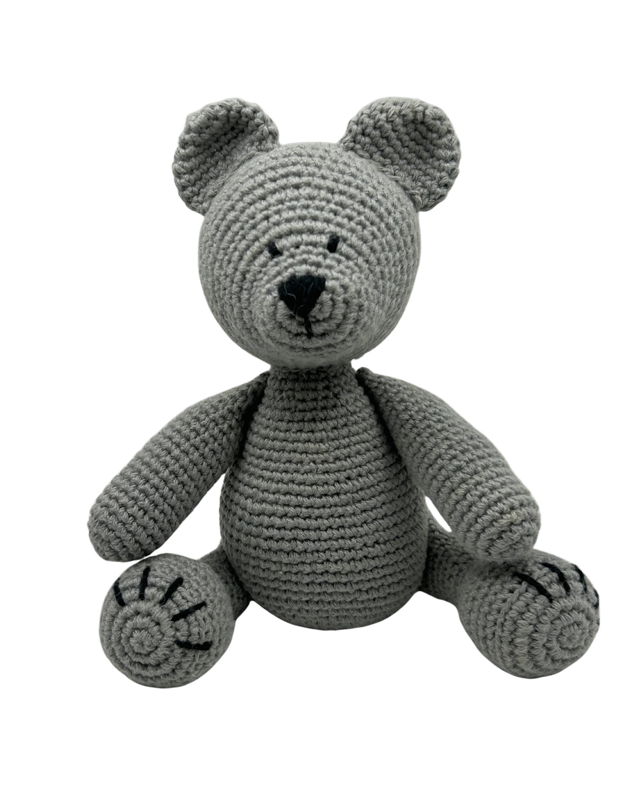 Figura tejida a mano con gancho, confeccionado con hilo de algodón suave color gris y relleno esponjoso que le da forma y firmeza. Medidas: 12 cm.