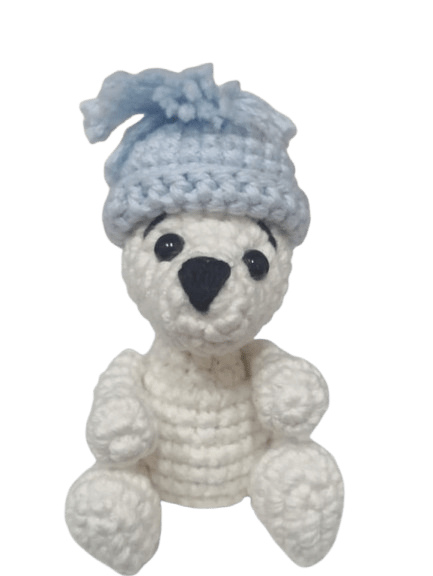 Figura tejida a mano con gancho, confeccionado con hilo de algodón suave color blanco con accesorio color azul y relleno esponjoso que le da forma y firmeza. Incluye: gorrito. Medidas: 18 cm.